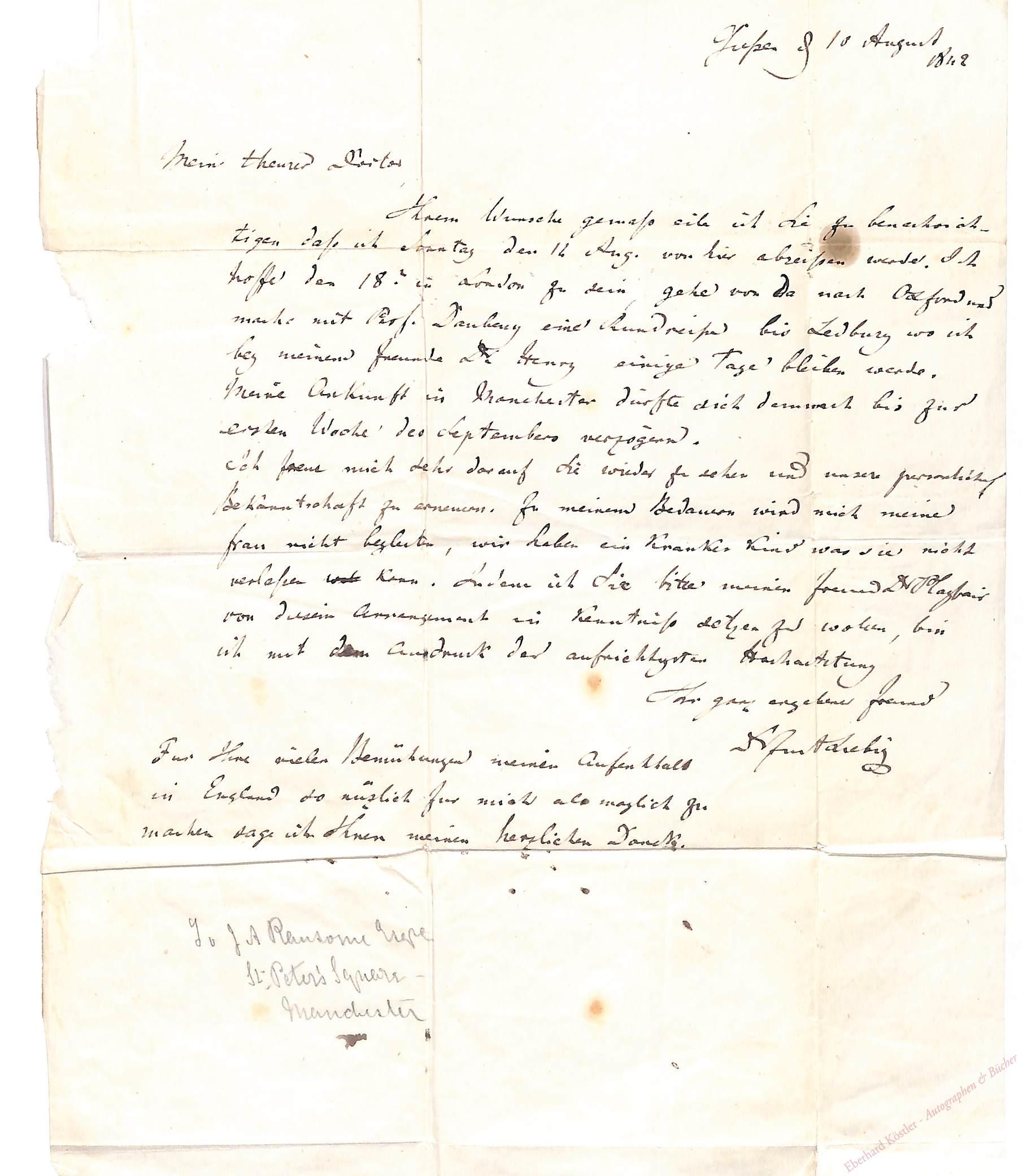 An den Arzt und Chirurgen Joseph Atkinson Ransome (1805-1867) in Manchester (1 St. Peter’s Square) über seine bevor stehende Englandreise: „[…] Ihrem Wunsche gemäß eile ich Sie zu benachrichtigen daß ich Sonntag den 12. Aug. von hier abreisen werde. Ich hoffe den 18.t in London zu sein, gehe von da nach Oxford und mache mit Prof. Daubeny eine Rundreise bis Ledbury wo ich bei meinem Freunde Dr. Henry einige Tage bleiben werde. Meine Ankunft in Manchester dürfte sich demnach bis zur ersten Woche des Septembers verzögern. Ich freue mich sehr darauf Sie wieder zu sehen und unsere Persönliche Bekanntschaft zu erneuern. Zu meinem Bedauern wird mich meine Frau nicht begleiten, wir haben ein krankes Kind was sie nicht verlassen kann. Indem ich Sie bitte meinen Freund Dr. Playfair von diesem Arrangement in Kenntnis setzen zu wollen, bin ich mit dem Ausdruck der aufrichtigsten Hochachtung […] Für Ihre vielen Bemühungen meinen Aufenthalt in England so nüzlich für mich als möglich zu machen sage ich Ihnen meinen herzlichen Dank.“ – Der Adressat lehrte ab 1843 an der „Royal Manchester School of Medicine and Surgery“. Der Chemiker Charles Daubeny (1795-1867) lehrte in Oxford. William Charles Henry (1804-1892) war 1836 der erste englische Schüler von Liebig. Lyon Playfair, 1. Baron Playfair (1818-1898) studierte 1839 in Gießen und wurde dort 1840 promoviert. – Linker Rand durch Montage etw. lädiert