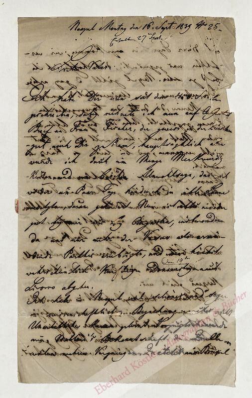 An seinen Vater, den Astronomen Joseph Johann von Littrow in Wien, u. a. über seinen Aufenthalt in Neapel, Besuch des Vesuvs, seine Bekanntschaften, chemische Versuche mit „Licht aus Oxygen und Hydrogen etc. – Littrow wurde 1842 Direktor der Sternwarte und Prof. der Astronomie in Wien. Sein großes Verdienst ist der Bau der Sternwarte in Währing. – Schrift stark durchscheinend, etw. beschäd. durch Tintenfraß u. durch Öffnen, leicht knittrig.