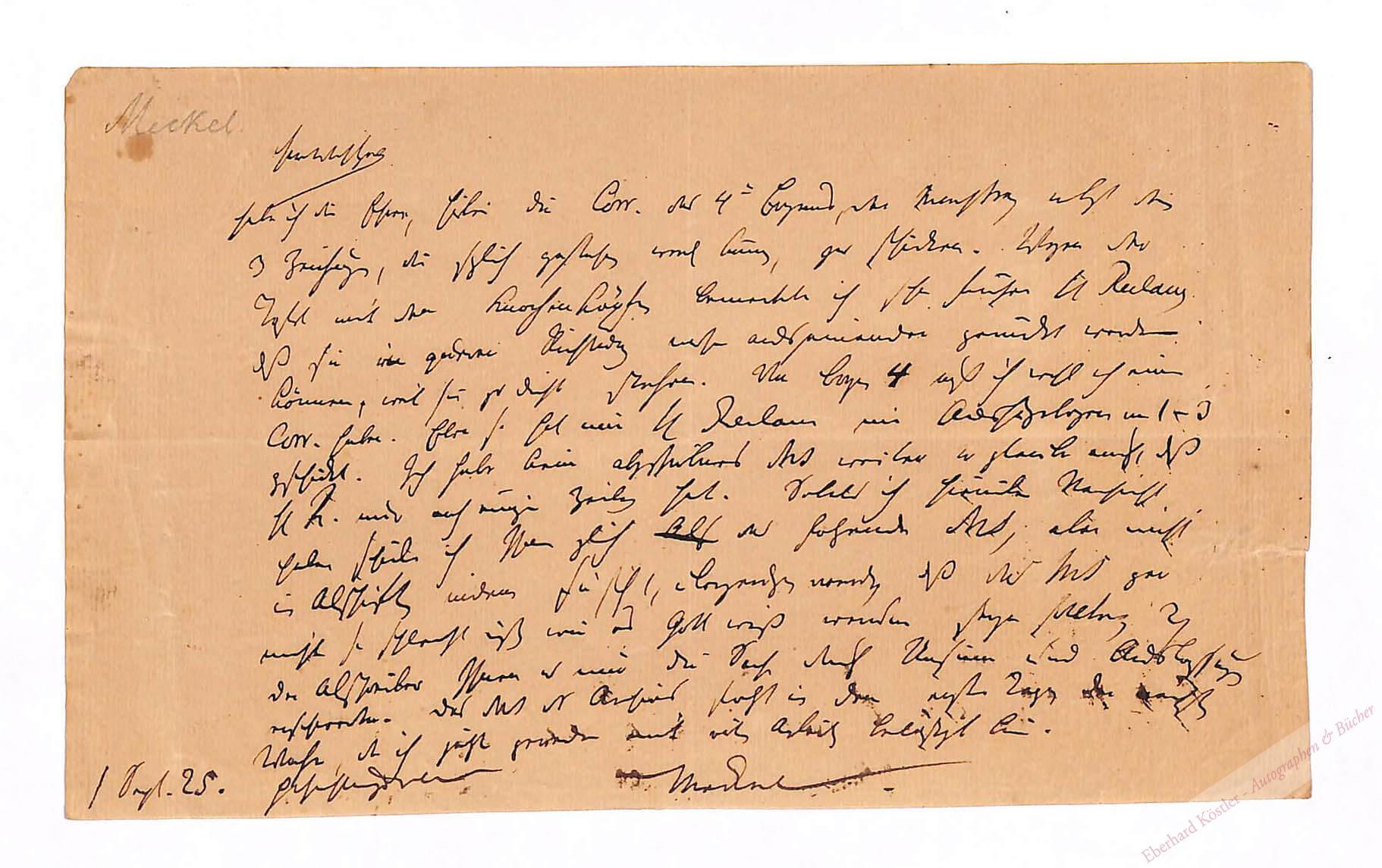 Eigenhändiger Brief mit Unterschrift Ohne Ort [Halle], 1. IX. 1825, Qu.-8°. 1 Seite.