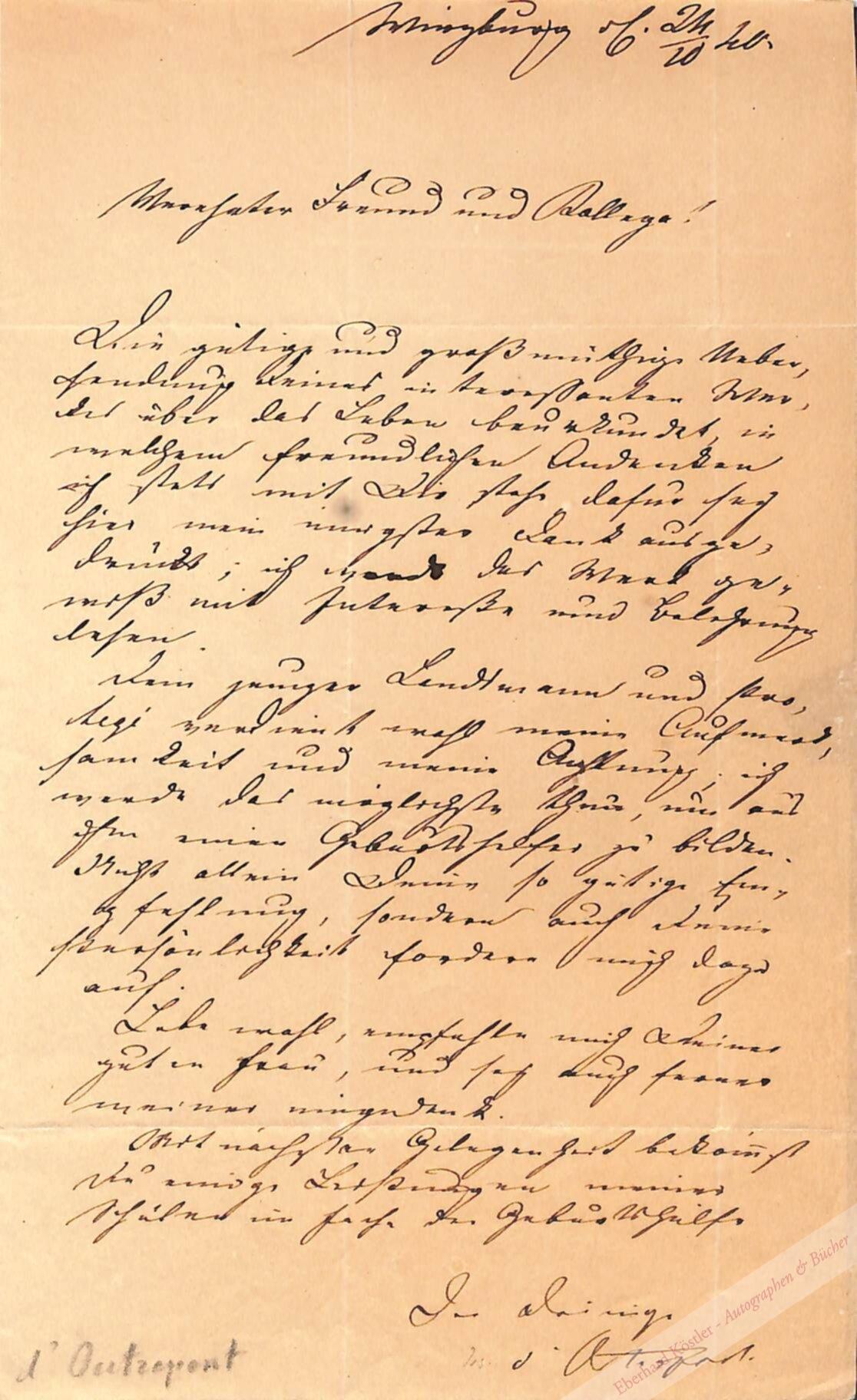 An seinen Kollegen Philipp Jakob Cretzschmar (1786-1845) in Frankfurt: „[…] Die gütige und großmüthige Uebersendung Deines interessanten Werkes über das [materielle] Leben [1840] beurkundet, in welchem freundlichen Andenken ich stets mit Dir stehe, dafür sey hier mein innigster Dank ausgedrückt […] Dein junger Landsmann und Protegé verdient wohl meine Aufmerksamkeit und meine Achtung; ich werde das möglichste thun, um aus ihm einen Geburtshelfer zu bilden […]“ – Joseph Servatius d’Outrepont war Professor für Geburtshilfe an der Julius-Maximilians-Universität Würzburg. Er erfreute sich als Arzt und Lehrer eines sehr großen Rufes, wissbegierige Schüler aus nah und fern zogen nach Würzburg, um an seinem Unterricht teilnehmen zu können.