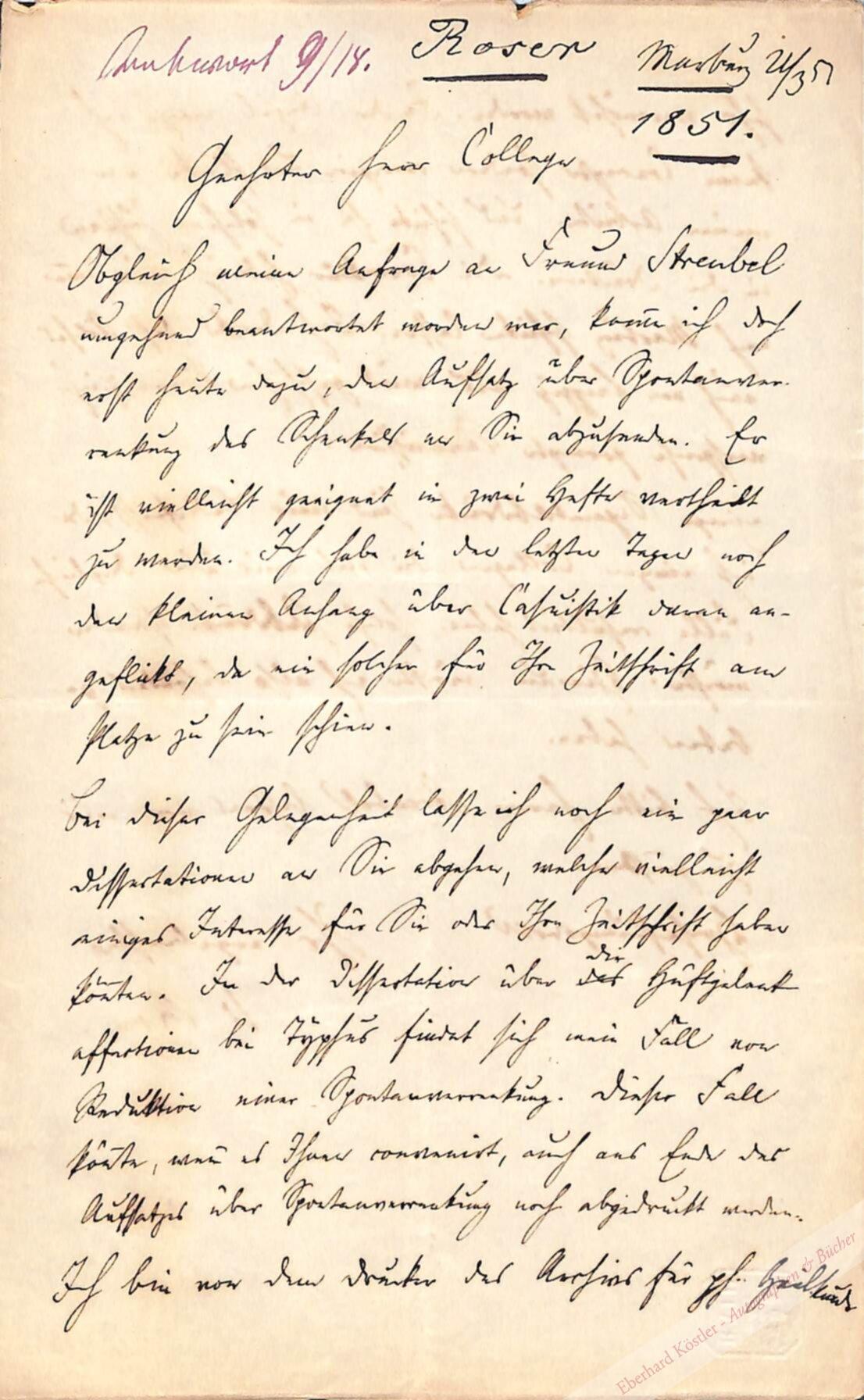 I. An Hofrat Winter mit einem Aufsatz: „[…] Obgleich meine Anfrage an Freund Streubel umgehend beantwortet worden war, komme ich doch erst heute dazu, den Aufsatz über Spontanverrenkung des Schenkels an Sie abzusenden […] Ich habe in den letzten Tagen noch den kleinen Anhang über Casuistik daran angeflickt […] In der Dissertation über die Hüftgelenkaffectionen bei Typhus findet sich mein Fall von Reduktion einer Spontanverrenkung. […]“ – III. An Benno Schmidt mit einem Attest: „Fräulein Gottlieb leidet seit vielen Jahren an Knieverkrümmung, mit leichter Sublupation nach hinten und außen, und Abweichung des Knies (genu vulgum) nach innen. Das Fibelaköpfchen steht nach der Kniekehle; die Kniescheibe verwachsen […] Die Aufgabe war, diese Knieverkrümmung durch Gypsverbände allmählig zu corrigieren […] Es ist wohl nothwendig, die Verbände noch bis zum Sommer fortzusetzen […]“ – Beiliegend die gedruckte Todesanzeige. – Roser gilt als Mitbegründer der um 1842 aufgekommenen deutschen Richtung der physiologischen Medizin.