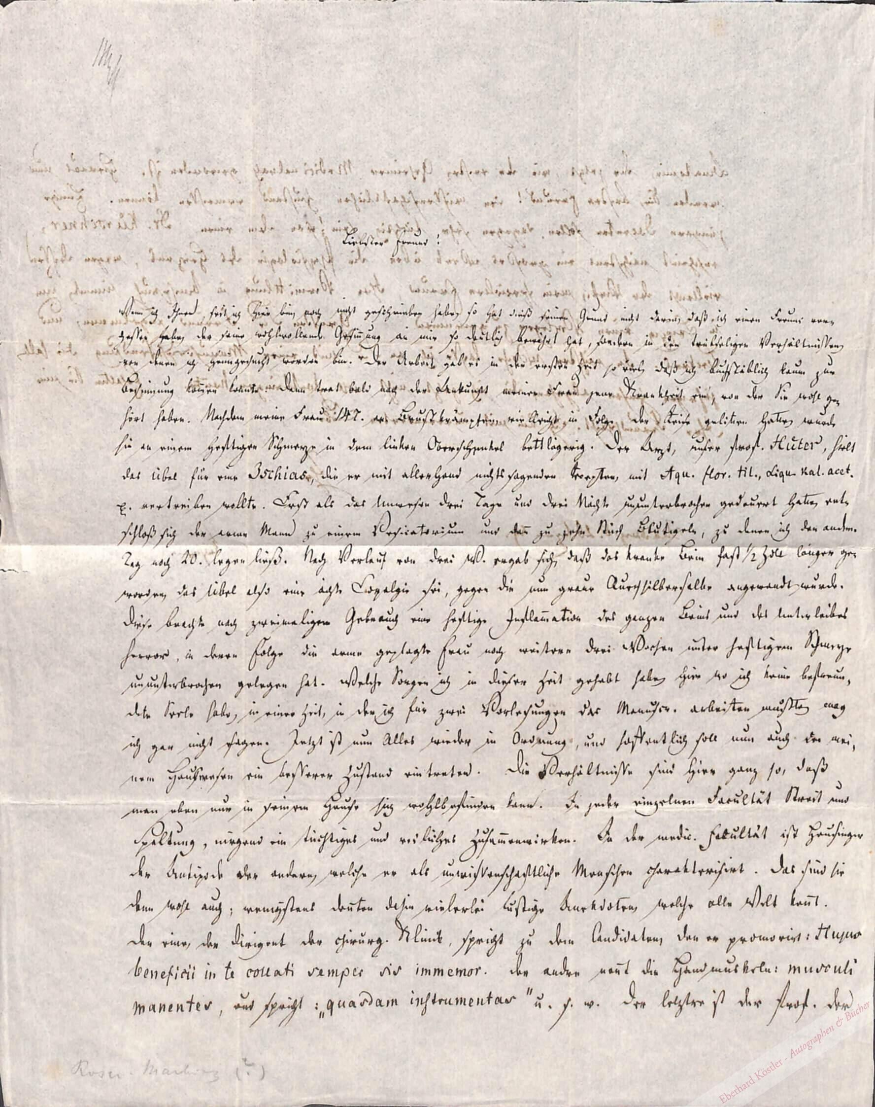 An einen Freund: „[…] Nachdem meine Frau […] an Brustkrämpfen, vielleicht in Folge der Reise gelitten hatte, wurde sie an einem heftigen Schmerze in dem linken Oberschenkel bettlägerig […] Welche Sorgen ich in dieser Zeit gehabt habe, hier wo ich keine befreundete Seele habe, in einer Zeit, in der ich für zwei Vorlesungen das Manuscr. arbeiten mußte, mag ich gar nicht sagen […] Die Verhältnisse sind hier ganz so, daß man eben nur in seinem Hause sich wohlbefinden kann. In jeder einzelnen Facultät Streit und Spaltung, nirgend ein tüchtiges und richtiges Zusammenwirken. In der medic. Fakultät ist Heusinger der Antipode der andern, welche er als unwissenschaftliche Menschen charakterisirt. Das sind sie denn wohl auch; wenigstens deuten dahin vielerlei lustige Anecdoten, welche alle Welt kennt […] Hieraus nun werden Sie […] den wissenschaftlichen Zustand ermessen können […]“ – Roser gilt als Mitbegründer der um 1842 aufgekommenen deutschen Richtung der physiologischen Medizin und schuf 1842 mit Carl August Wunderlich das „Archiv für physiologische Heilkunde“.