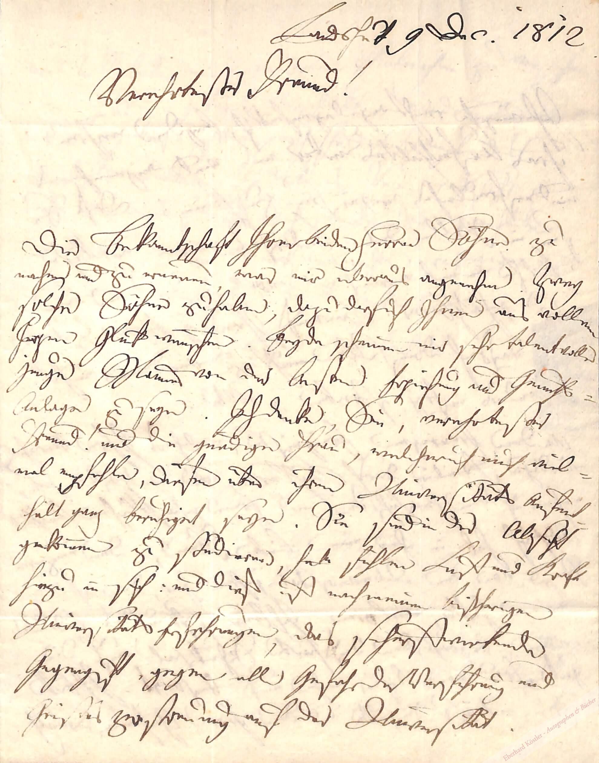 Eigenhändiger Brief mit Unterschrift Landshut, 9. XII. 1812, 4° (21,5 x 16,5 cm). 3 Seiten. Doppelblatt mit Adresse und Lacksiegel sowie Poststempel.