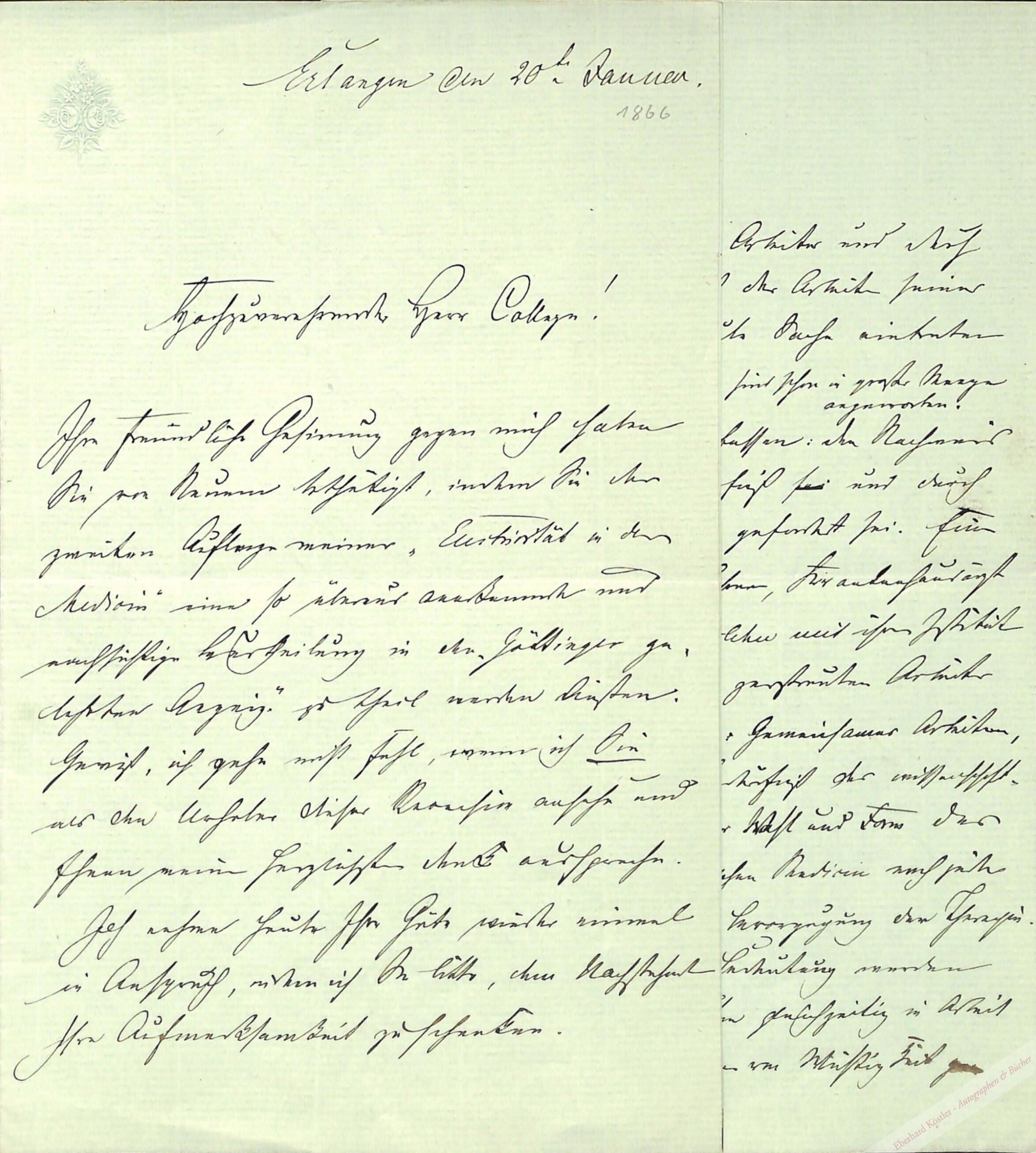 Bedeutendeer Brief an einen Kollegen, dem er für seine positive Rezension des Buches „Electricität in der Medizin“ in den „Göttinger gelehrten Anzeigen“ dankt und die Herausgabe eines „Deutschen Archivs für Klinische Medizin“ ankündigt: „[…] Daß wir Kliniker und Krankenhausärzte ebensowie die praktischen Ärzte mit unseren Arbeiten hier und dorthin irren und nirgends recht zu Hause sind, ist der Würde und Bedeutung unserer Disciplin nicht angemessen […]“ Ausführlich über den Fortgang und die Wahl der Beiträger zu dem geplanten „Archiv“. Ziemssen erläutert das Programm der Zeitschrift: „Bände oder Jahrgänge ca. 30. 40 Bogen stark in ca. 6 Heften. Erscheinen des ersten Heftes nach der Ostermesse (Juni). Material für die ersten Hefte liegt bereits genügend vor, doch wäre es für den von uns dringend erhofften Fall, daß Sie uns vorangingen resp. als Mitherausgeber betheiligten, sehr wünschenswerth, im I oder II Heft eine Arbeit von Ihnen […] erscheinen zu lassen […]“ – Ziemssen wurde 1863 an der Universität Erlangen Professor der klinischen Medizin und ging 1874 als Direktor des Allgemeinen Krankenhauses nach München.