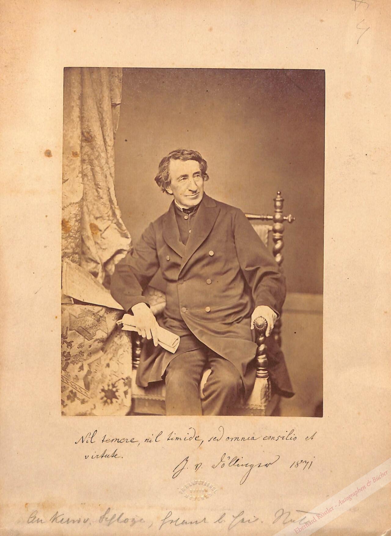 Schönes Atelier-Porträt im Lehnstuhl mit lateinischem Motto. – Unterrand mit möglicherweise eigenh. Bleistiftwidmung.
