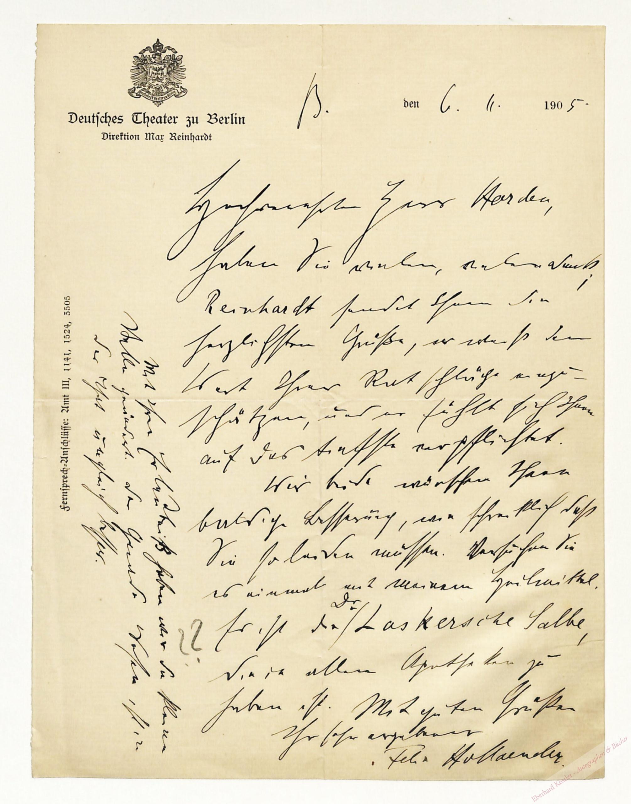 An Maximilian Harden: „[… Max] Reinhardt sendet Ihnen die herzlichsten Grüße, er weiß den Wert ihrer Ratschläge einzuschätzen, und er fühlt sich Ihnen auf das tiefste verpflichtet. Wir beide wünschen Ihnen baldige Besserung, wie schrecklich daß Sie so leiden müssen. Versuchen Sie es einmal mit meinem Heilmittel. Es ist die Dr. Laskersche Salbe […]“ – Von 1902 an wirkte Hollaender als Dramaturg und von 1904 an auch Regisseur bei Max Reinhardt. 1920 bis 1923 leitete er das Deutsche Theater Berlin.