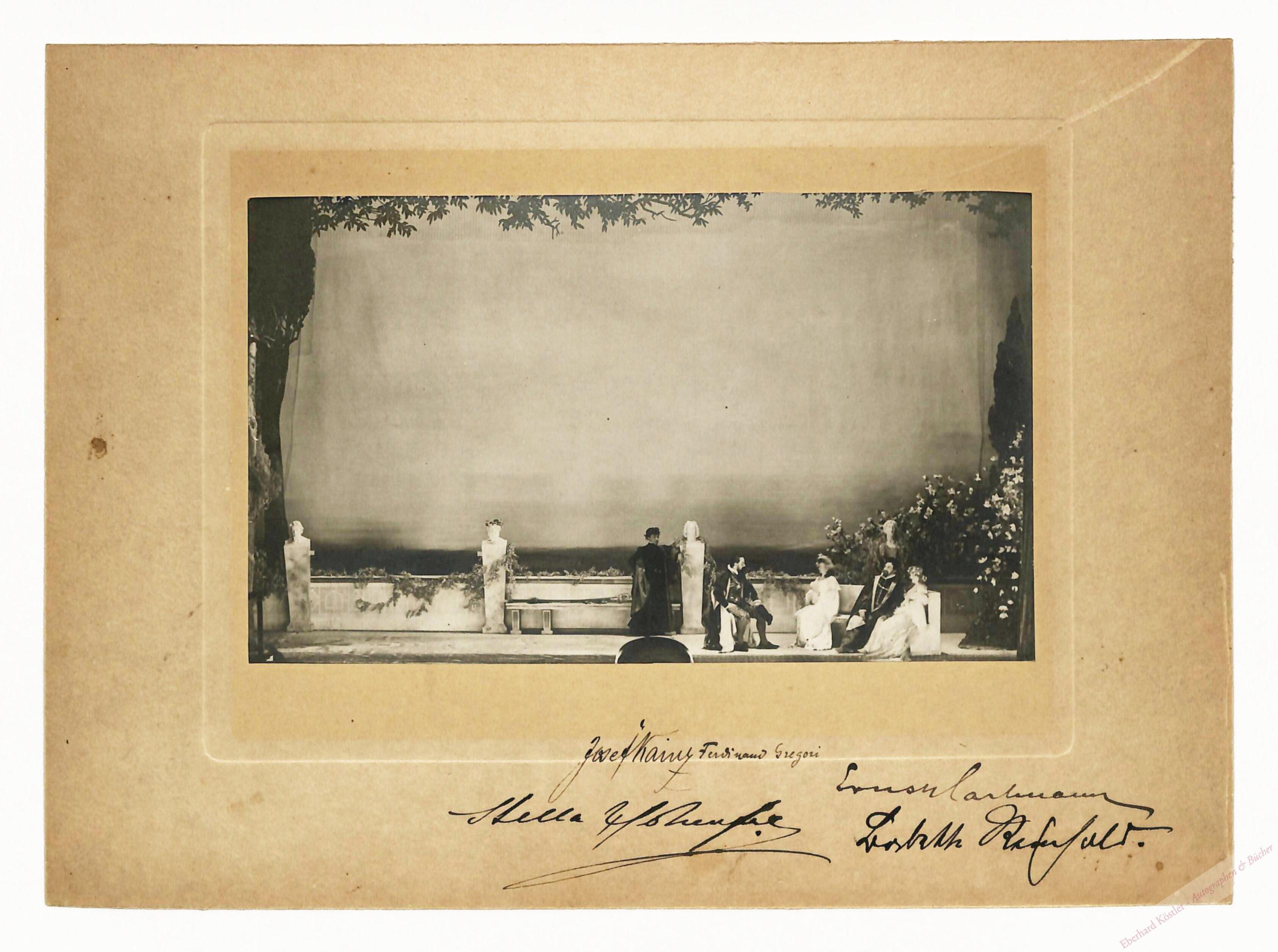 Bühnenphoto einer Aufführung von Goethes „Torquato Tasso“ im Wiener Burgtheater. Das Bild trägt außer der Unterschrift von Kainz (als Tasso) noch diejenigen seiner ebenfalls abgebildeten Schauspielerkollegen Ferdinand Gregori (als Antonio Montecatino), Ernst Hartmann (als Alfons der Zweite), Stella Hohenfels (als Leonore d’Este) und Babette (Devrient)-Reinhold (als Leonore Sanvitale). – Karton etw. gebräunt.