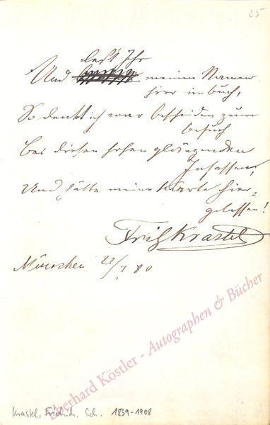 „Und lest Ihr meinen Namen hier im Buch, | So denkt ich war bescheiden zum Besuch […]“. – Krastel wirkte am Burgtheater. – Aus dem Stammbuch Ernst von Possart.