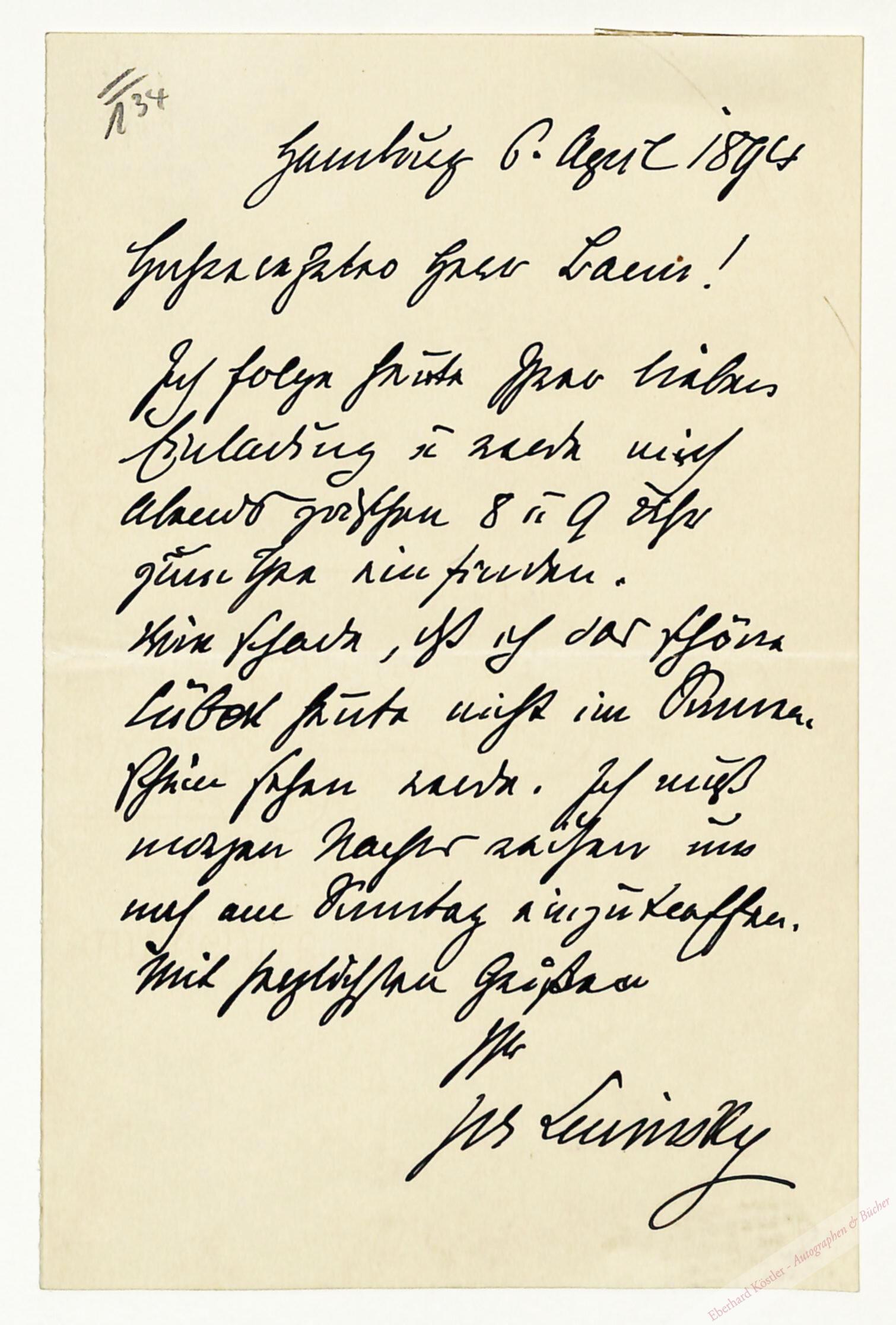 An Herrn Lauer mit der Zusage zu einer Einladung nach Lübeck.