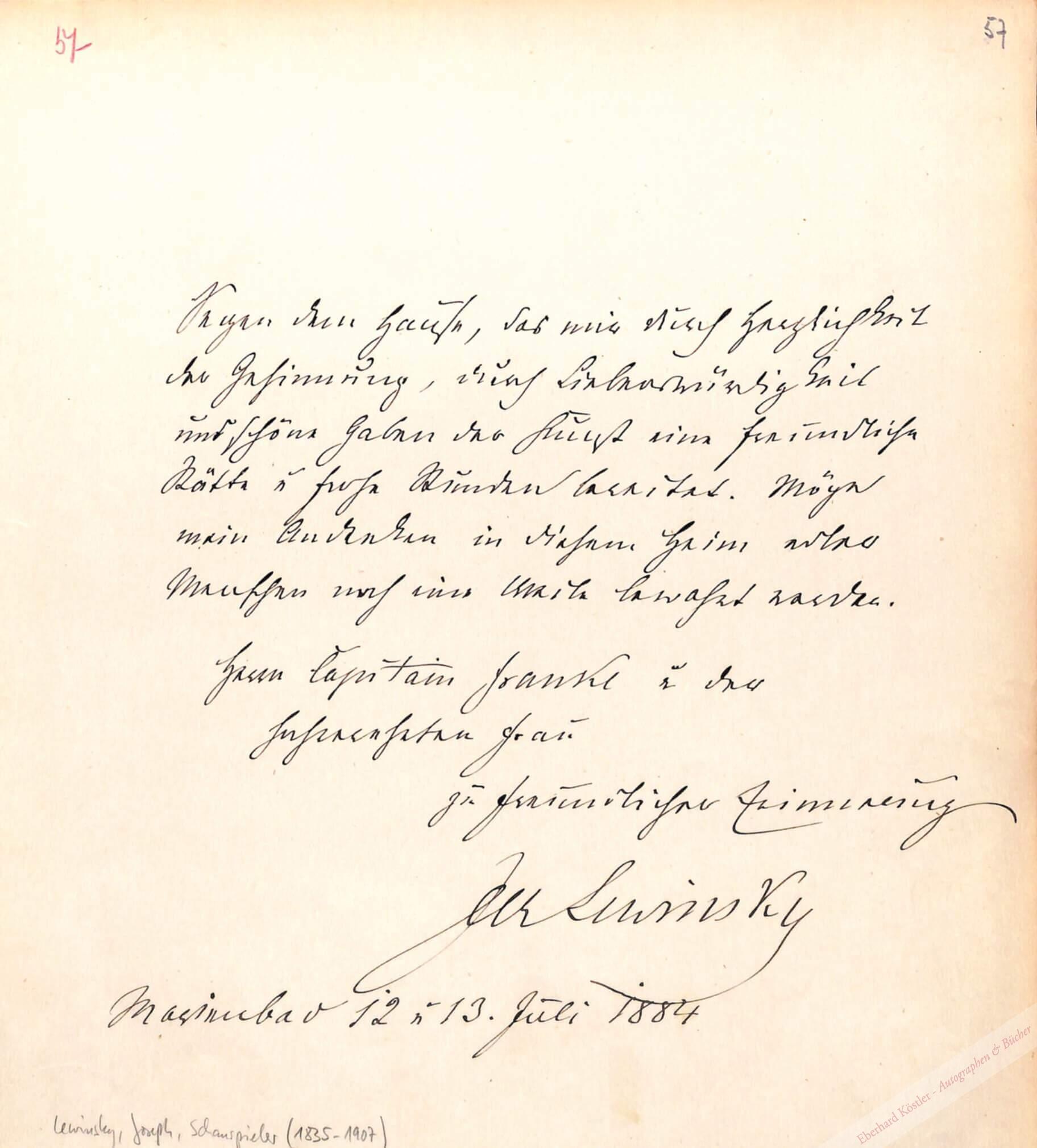 „Segen dem Hause, das mir durch Herzlichkeit der Gesinnung, durch Liebenswürdigkeit und schöne Gaben der Kunst eine freundliche Stätte u. frohe Stunden bereitet. Möge mein Andenken in diesem Heim edler Menschen noch eine Weile bewahrt werden. […]“. – Lewinsky debütierte 1855 am Theater an der Wien, ging 1856 an das Brünner Stadttheater und gab 1858 als Franz Moor sein Debüt am Wiener Burgtheater.