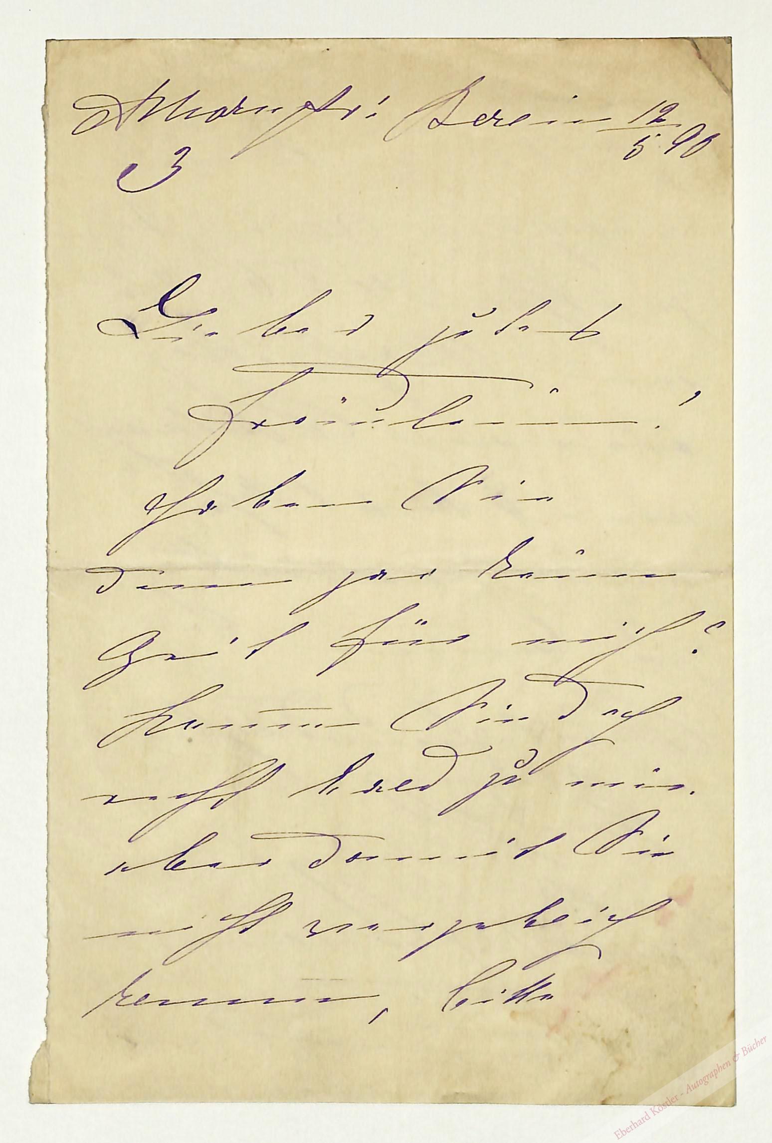 An ein Fräulein: „[…] Haben Sie denn gar keine Zeit für mich? Kommen Sie doch recht bald zu mir […]“ – Ab 1883 gehörte Niemann-Raabe dem Deutschen Theater in Berlin an.