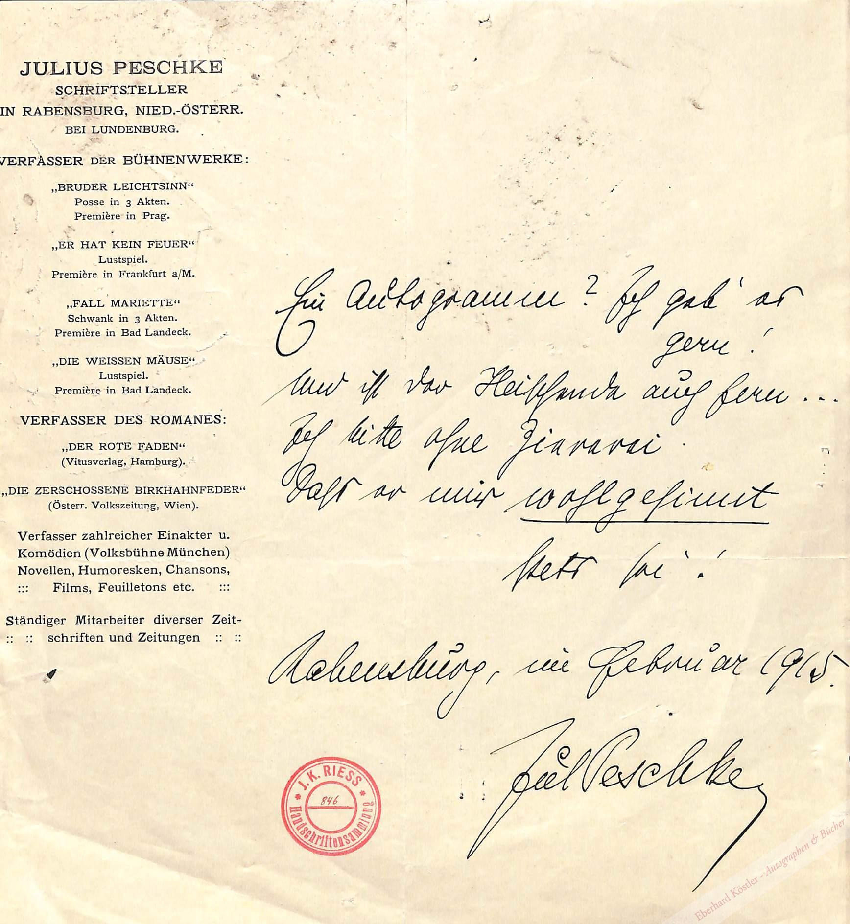 „Ein Autogramm? Ich geb‘ es gern! | Und ist der Heischende auch fern… | Ich bitte ohne Ziererei | Dass er mir wohlgesinnt stets sei!“ – Mit Auflistung seiner Bühnenwerke. Roter Sammlungsstempel auf der Vorderseite.