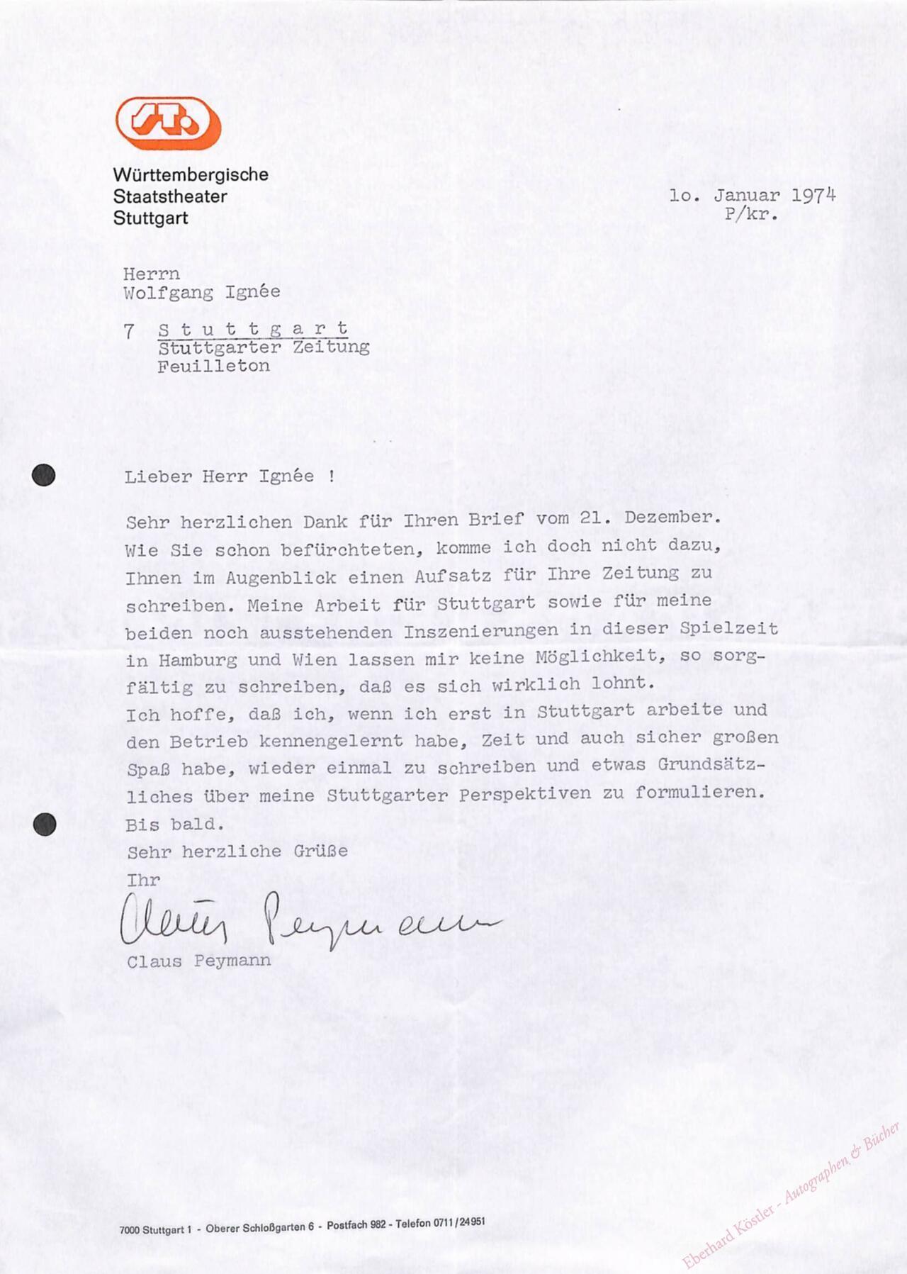 An den Redakteur Wolfgang Ignée: „… Meine Arbeit für Stuttgart sowie für meine beiden noch ausstehenden Inszenierungen in dieser Spielzeit in Hamburg und Wien lassen mir keine Möglichkeit, so sorgfältig zu schreiben, daß es sich wirklich lohnt. Ich hoffe, daß ich, wenn ich erst in Stuttgart arbeite und den Betrieb kennengelernt habe, Zeit und auch sicher großen Spaß habe, wieder einmal zu schreiben und etwas Grundsätzliches über meine Stuttgarter Perspektiven zu formulieren …“ – Gelocht.
