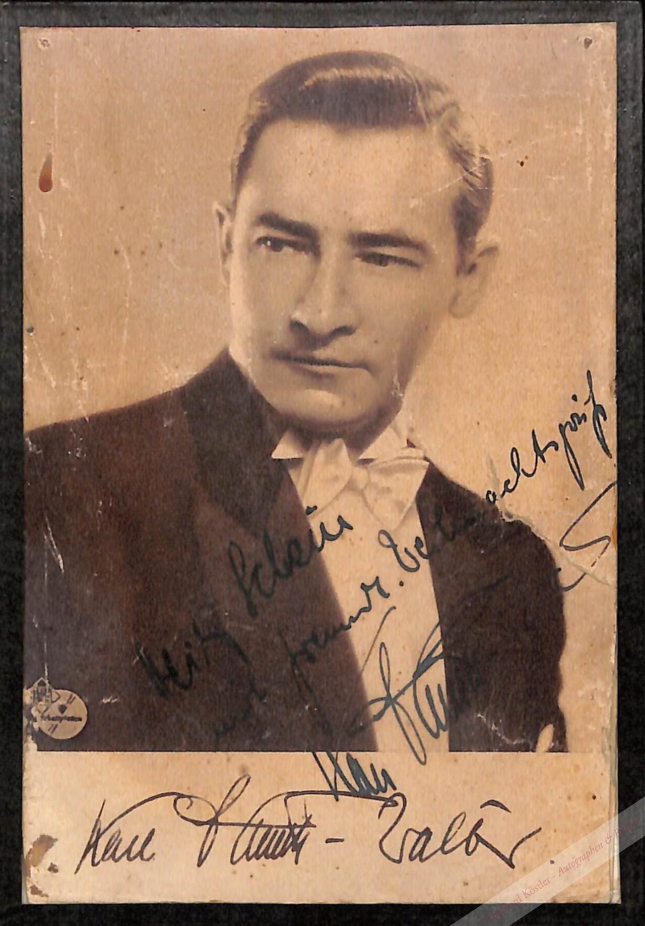 Porträtfotografie (Lichtdruck) mit eigenh. Widmung und Unterschrift auf der Bildseite. Ohne Ort und Jahr, ca. 1930, 14,5 x 10,5 cm. Unter Leinenstreifen und Glas gerahmt. – Beschabt, etw. schadhaft.
