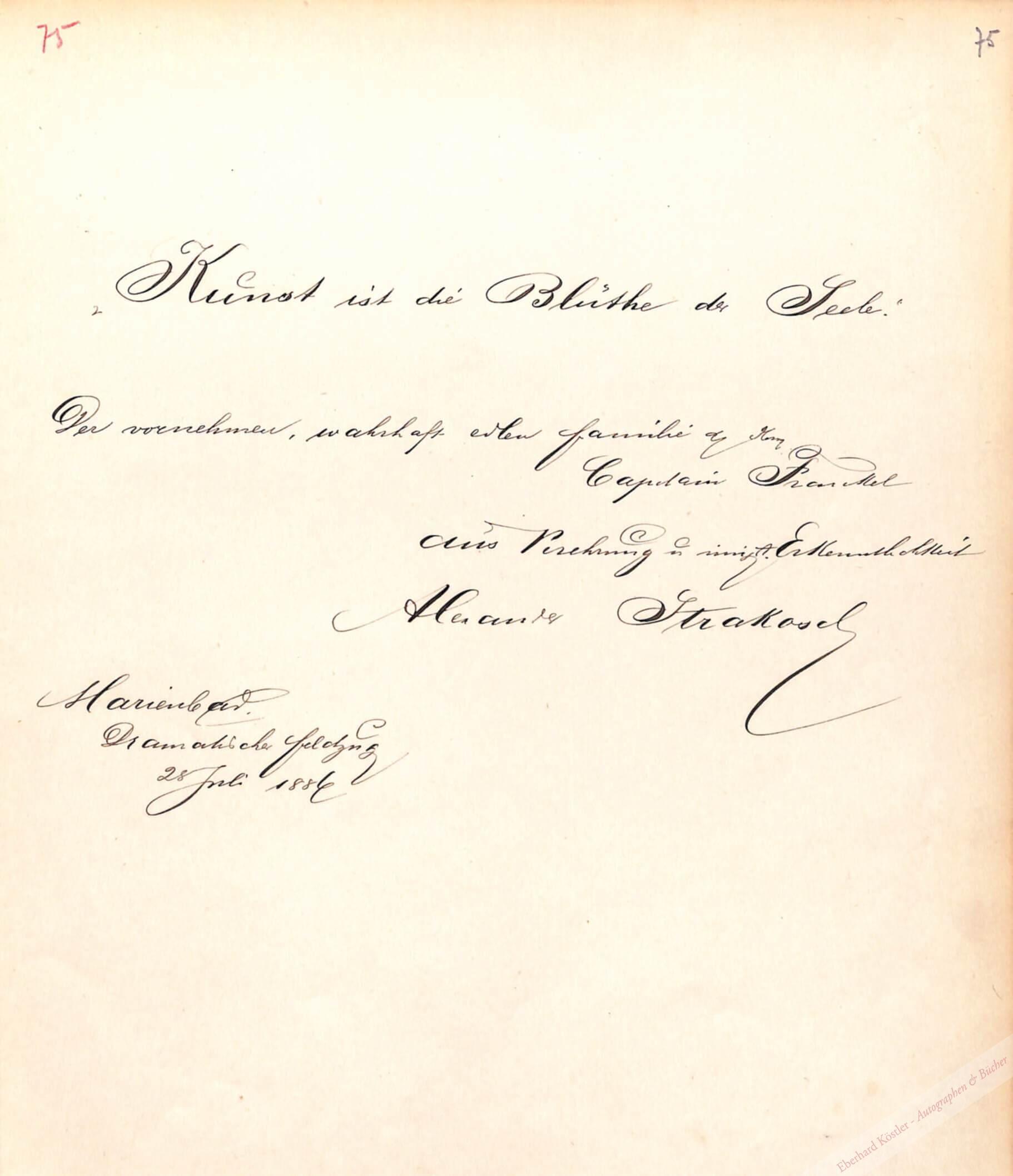 „Kunst ist die Blüthe der Seele. Der vornehmen, wahrhaft edlen Familie des Herrn Capitain Frankl aus Verehrung u. innigst. Erkenntlichkeit …“ – Strakosch spielte seit 1862 am Deutschen Theater in Pest, am Hoftheater in Hannover und an der Pariser Comédie française. Später gab er Rezitationsabende, die ihn bis in die USA führten. Seit 1888 war er zunächst Professor an der Akademie in München, dann Sprecherzieher am Wiener Burgtheater.