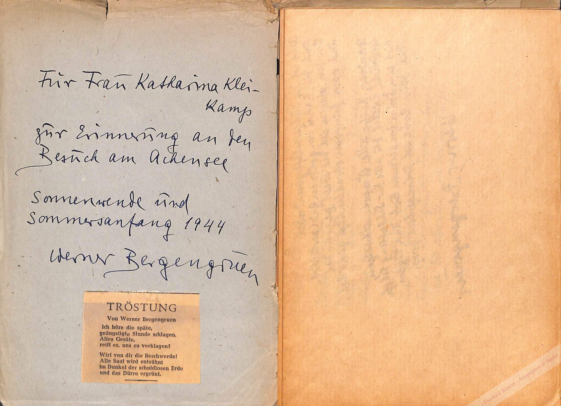 Faksimiledrucke in kalligraphischer Handschrift sowie ein Handschriftenfaksimile des Dichters. – Innendeckel des Vorderumschlags mit eigenh. Widmung „Für Frau Katharina Kleikamp zur Erinnerung an den Besuch am Achensee | Sonnenwende und Sommeranfang 1944 | Werner Bergengruen.“ – Sehr selten: nicht bei Wilpert-G., kein Ex. im KVK. – Mit den Gedichten „Die vier Elemente“ (Faksimile, doppelt gefaltet), „Lobgesang und Lobrauch“, „Großer Herbst“ (beide doppelt gefaltet), „Mit einer Halskette“, „Das steigende ruf ich“, „Der Hund in der Kirche“, „Eximia perennant“, „Der Schutzbrief“, „Stimme des Gefallenen“, „Die Meise“, „Die Erwählung“ (Doppelblätter), „Wandlung“, „Befreiung“, „Abends“ (Einzelblätter). – Papierbedingt leicht gebräunt. – Beilage.