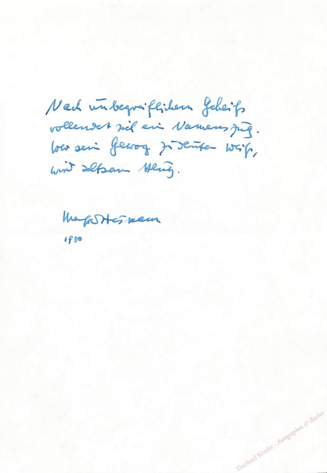 „Nach unbegreiflichen Geheiß | vollendet sich ein Namenszug. | Wer sein Gewog zu deuten weiß, | wird seltsam klug.“ – Beiliegend eine Portraitpostkarte mit eigenh. U. auf weißem Bildunterrand und eigenh. Adresse auf der Rückseite.