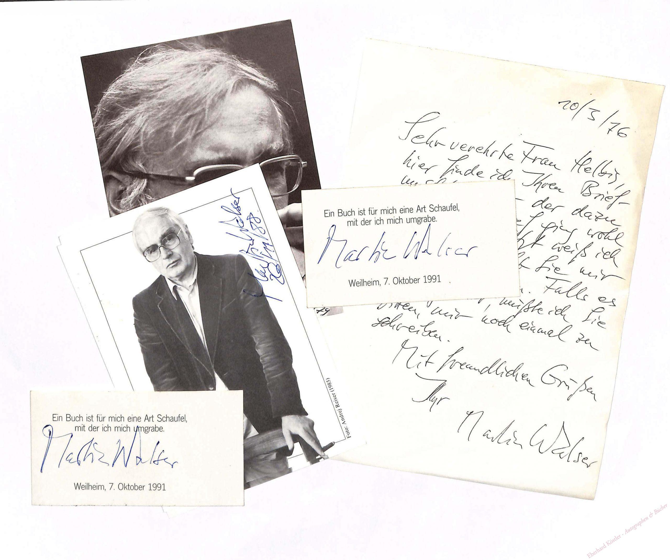 An eine Dame: „[…] hier finde ich Ihren Briefumschlag, aber der dazu gehörende Brief ging wohl verloren. Jetzt weiß ich nicht, weshalb Sie mir geschrieben haben. Falls es wichtig war, müßte ich Sie bitten, mir noch einmal zu schreiben […]“ – Beiliegend 7 Autogramme auf Porträtkarten und kleinen Blättern, 1976-91.