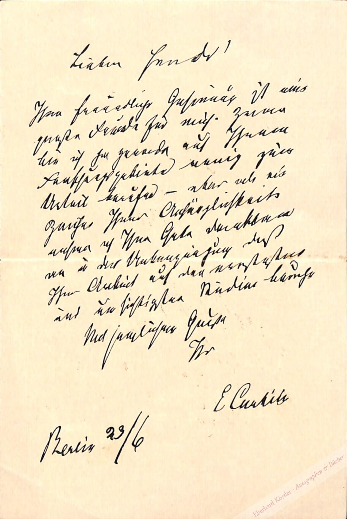 An einen Gelehrten, der ihn darum gebeten hatte, einem neuen Buch eine Dedikation an Curtius voranstellen zu dürfen: „[…] Ihre freundliche Gesinnung ist eine große Freude für mich. Zwar bin ich gerade auf Ihrem Forschungsgebiete wenig zum Urtheil berufen – aber als ein Zeichen Ihrer Anhänglichkeit nehme ich Ihre Gabe dankbar an in der Überzeugung, daß Ihre Arbeit auf den ernstesten und umsichtigsten Studien beruhe […]“ – Curtius, Archäologe und Althistoriker, Professor und Akademie-Sekretär in Göttingen, Mitglied der preuß. Akademie der Wissenschaften und Ritter des preuß. Ordens Pour le Mérite für Wissenschaft und Künste, bereiste mehrmals Griechenland und leitete Ausgrabungen in Olympia.