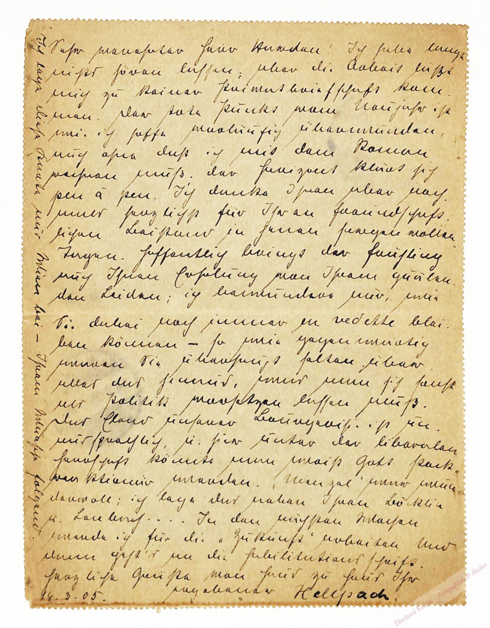 An Maximilian Harden mit Dank für seine Unterstützung in sorgenvollen Tagen und Ankündigung von Beiträgen. – Hellpach publizierte zwischen 1898 und 1903 in den „Sozialistischen Monatsheften“, dann in der Berliner Tageszeitung „Der Tag“.