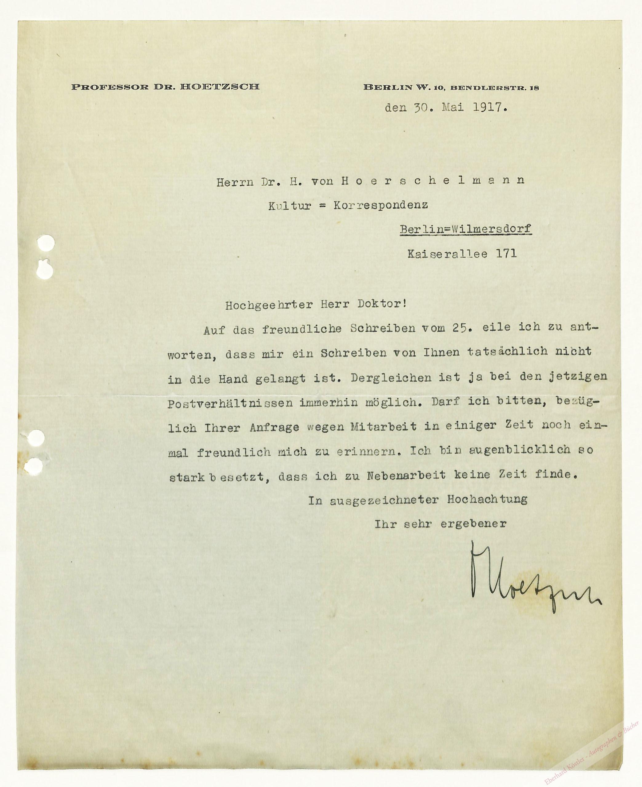 An Harald von Hoerschelmann wegen eines Beitrags für dessen Kultur-Korrespondenz. – Hoetzsch lehrte Osteuropäische Geschichte an der Universität Berlin.