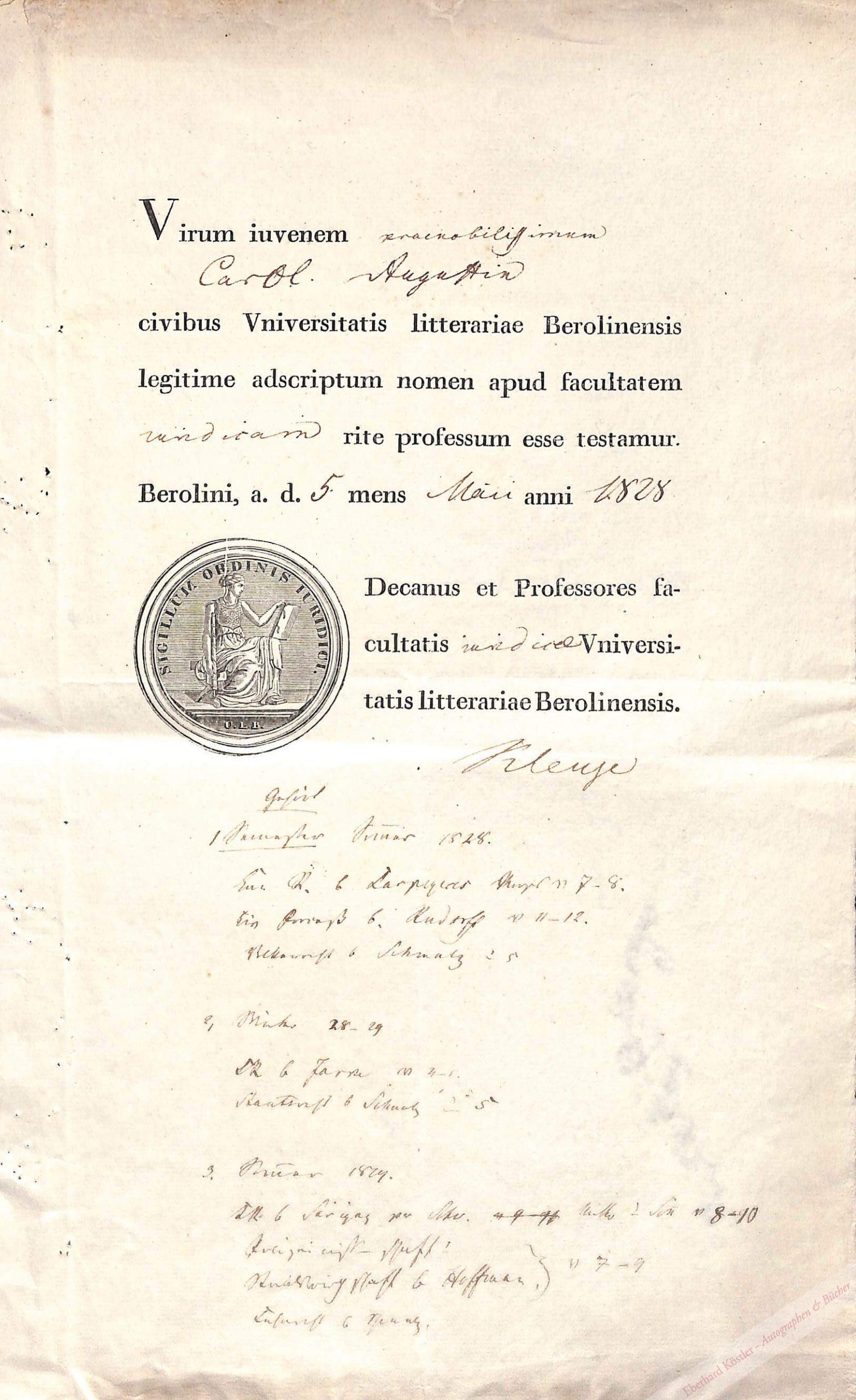 Immatrikel für den späteren Finanzrat Karl Augustin (1808-1902); mit Angabe der gehörten juristischen Vorlesungen von Sommer 1828-29 in der unteren Blatthälfte. Klenze war 1828/29 Rektor der Friedrich-Wilhelms-Universität zu Berlin.
