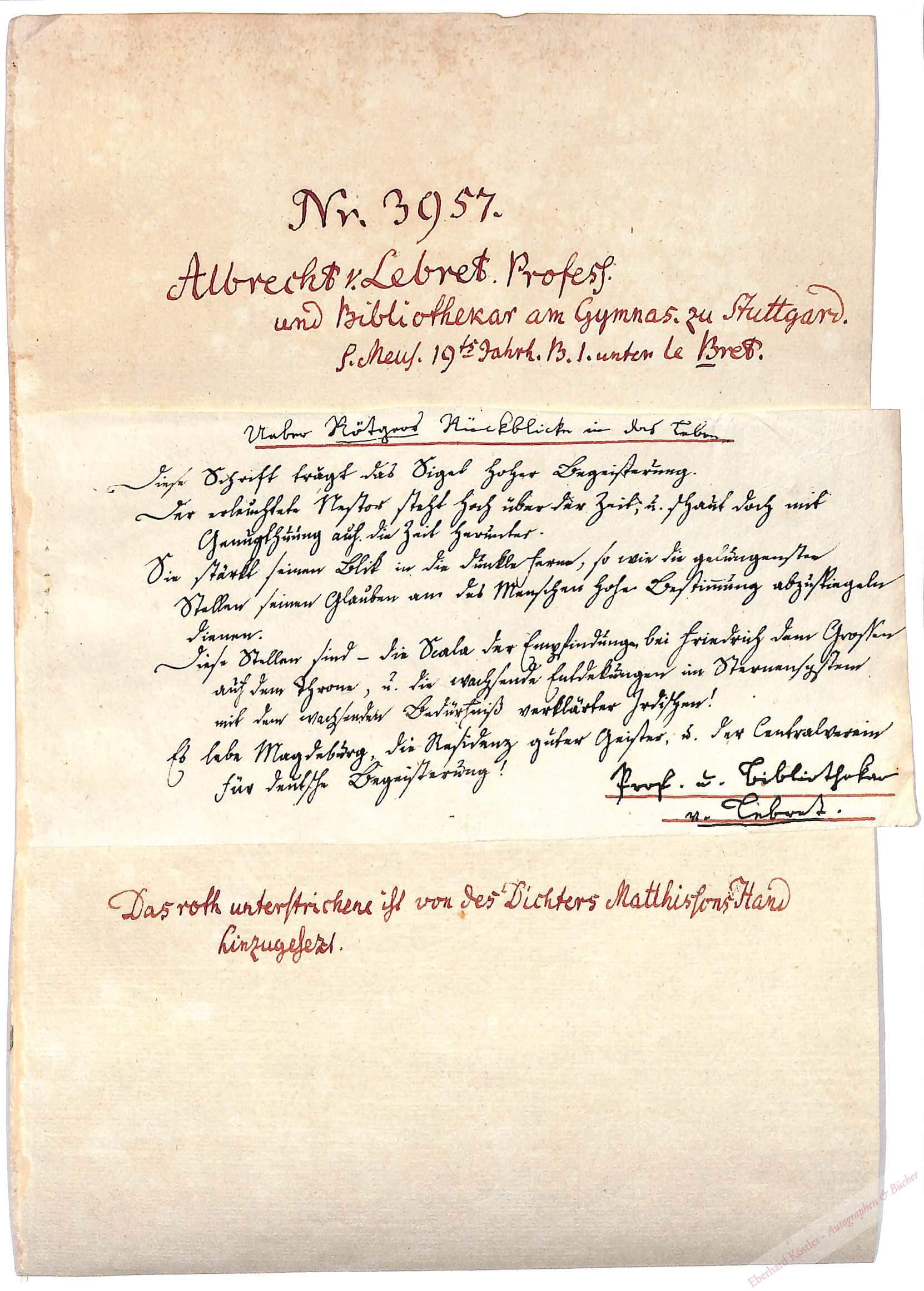 Mit eigenhändigen Zusätzen des Dichters Friedrich von Matthisson (1761-1831): „Ueber Rötgers Rückblicke in das Leben | Prof. u. Bibliothekar v. Lebret.“ – „Diese Schrift trägt das Sigel hoher Begeisterung […] Es lebe Magdeburg, die Residenz guter Geister, und der Centralverein für deutsche Begeisterung!“ – Gemeint ist: Gotthilf Sebastian Rötger (1749-1831), „Rückblicke ins Leben“ (Magdeburg 1827). – Aus der Sammlung Rötger mit dessen roter Beschriftung.