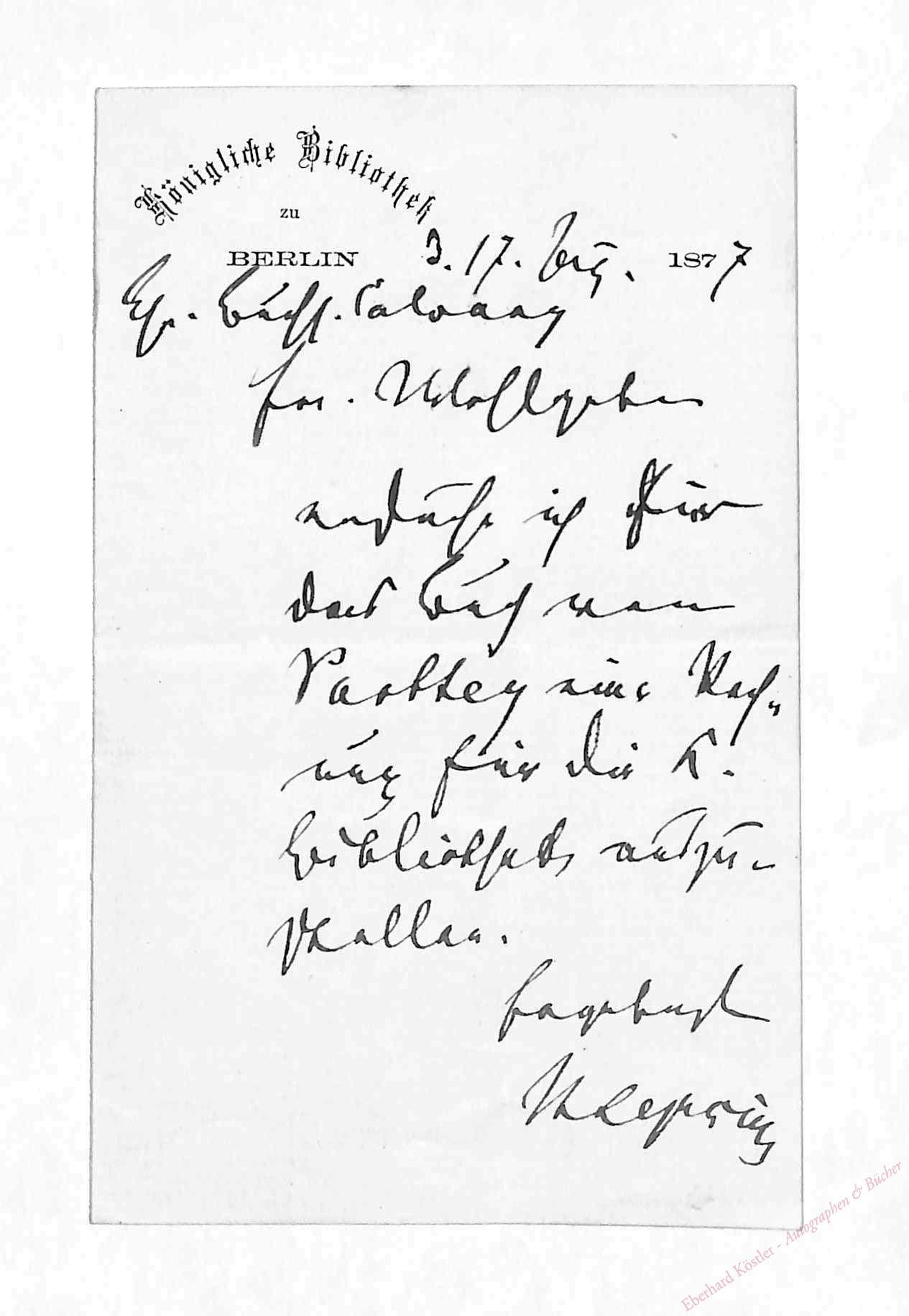 An die Buchhandlung S. Calvary in Berlin mit der Bitte um eine Rechnung für das Buch von Gustav Parthey.