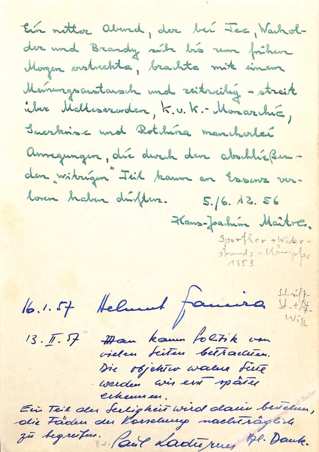 Eintrag aus einem Gästebuch. – Maître gilt als einer der beiden jungen Männer, die beim Aufstand des 17. Juni 1953 Steine auf einen russischen Panzer werfen. Nach der Teilnahme am 17. Juni und der Flucht in den Westen studiert er bis 1961 in Innsbruck und Bonn Literatur, Geografie und Psychologie. Danach folgen einige Jahre als Auslandskorrespondent der „Welt“, als Dozent an der University of Nigeria und schließlich als Deutsch-Professor an der McGill University in Montreal. 1976 ist er dort deutscher Olympia-Attaché. Maître wird anschließend Leitender Redakteur im Axel Springer Verlag und zieht 1983 in die USA. Dort lebte und lehrte er – zeitweise im eigenen Institut – an der Boston University.