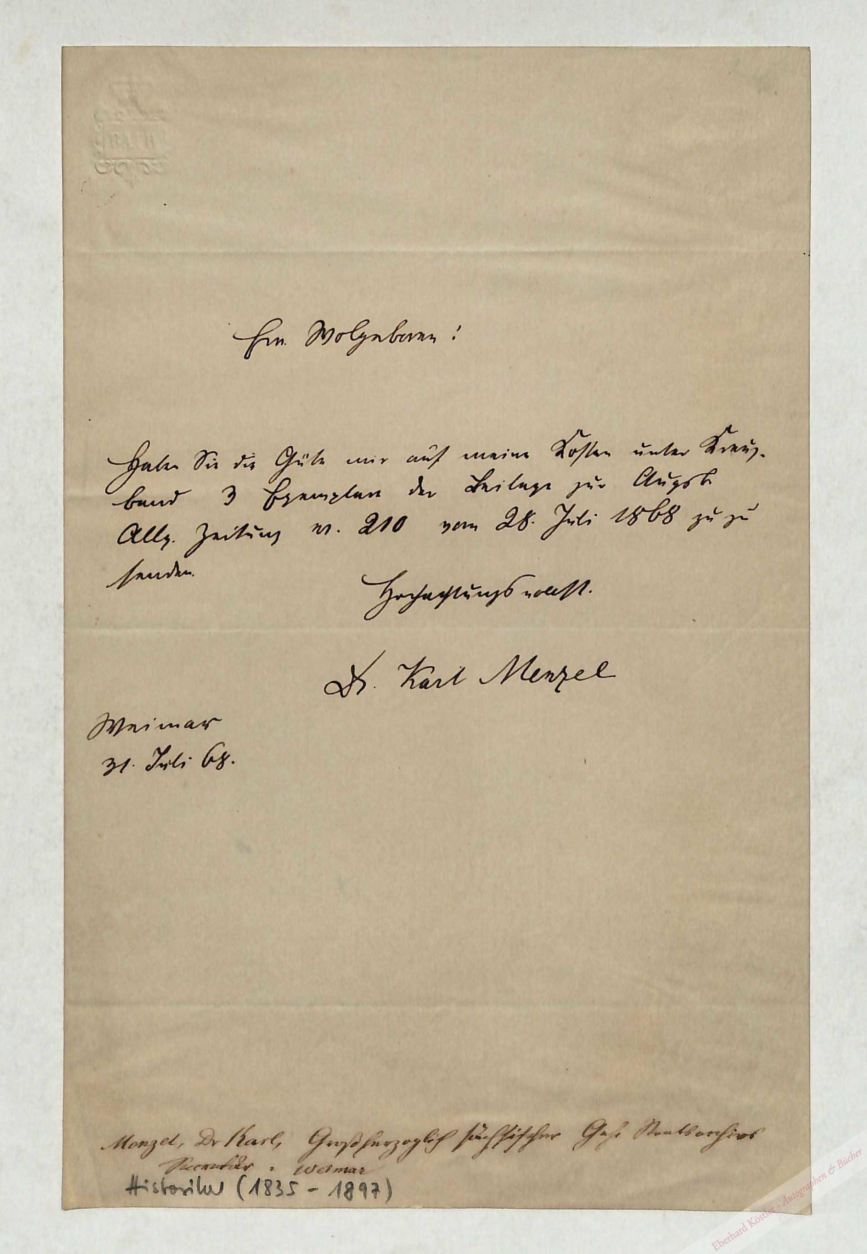 Eigenhändiger Brief mit Unterschrift Weimar, 31. VII. 1868, 8°. 1 Seite. Doppelblatt. – Bestellt eine Zeitungsbeilage.