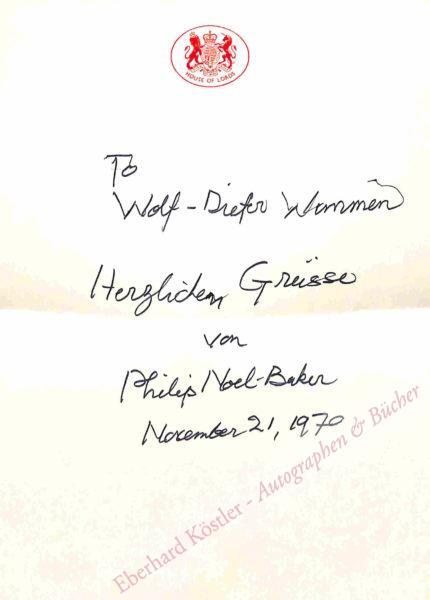 „To Wolf-Dieter Wimmer. Herzliche Grüsse von Philip Noel-Baker November 21, 1979“. – Noel-Baker war Leichtathlet, Pazifist und Mitglied des britischen Parlaments, Teilnehmer an den Versailler Verhandlungen 1919, Mitglied der britischen Delegation beim Völkerbund, parlamentarischer Sekretär in der Regierung Churchill, Vorsitzender der Labour Party, Chefunterhändler im britischen Commonwealth und ein entschiedener Gegner der europäischen Aufrüstung. Bei den Olympischen Spielen 1920 gewann er eine Silbermedaille, 1959 erhielt er den Friedensnobelpreis für seinen Einsatz für den internationalen Frieden und ist damit der einzige Nobelpreisträger mit einer Olympia-Medaille.