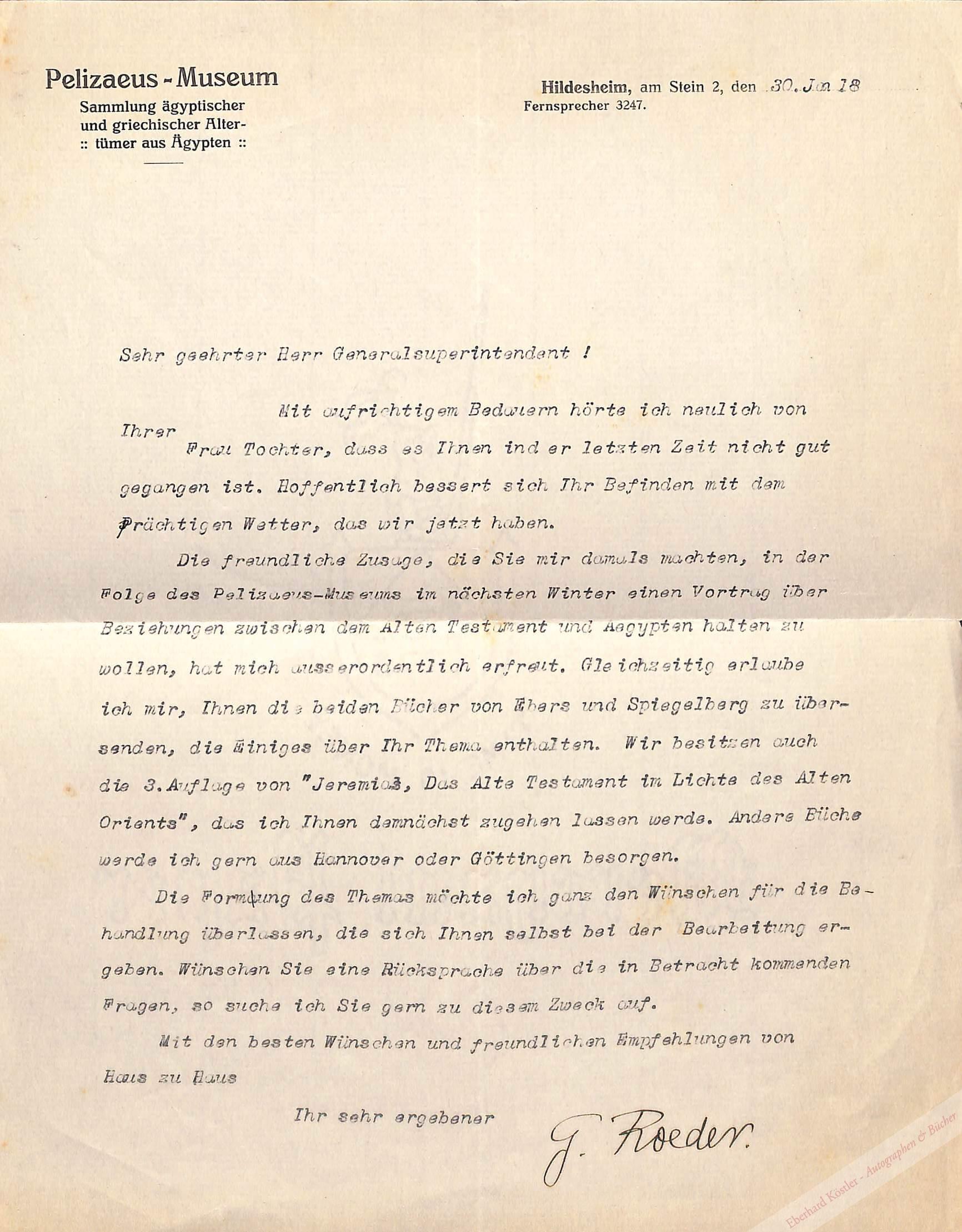Maschinengeschriebener Brief mit eigenhändiger Unterschrift Hildesheim, 30. I. 1918, Gr.-4°. 1 Seite. – Wegen eines Vortrags. – Beiliegend ein eigenh. Billett.