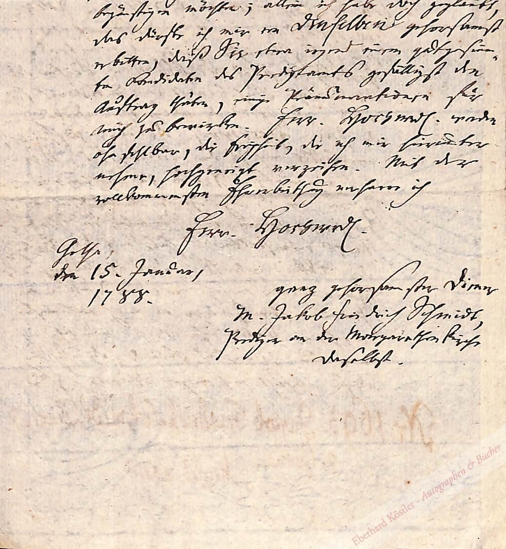 Das obere Drittel fehlt. – Wegen der Pränumeration auf eine geplante Predigtsammlung. – Schmidt war Dichter, Pfarrer und Lehrer in Gotha. – Aus der Sammlung Rötger.