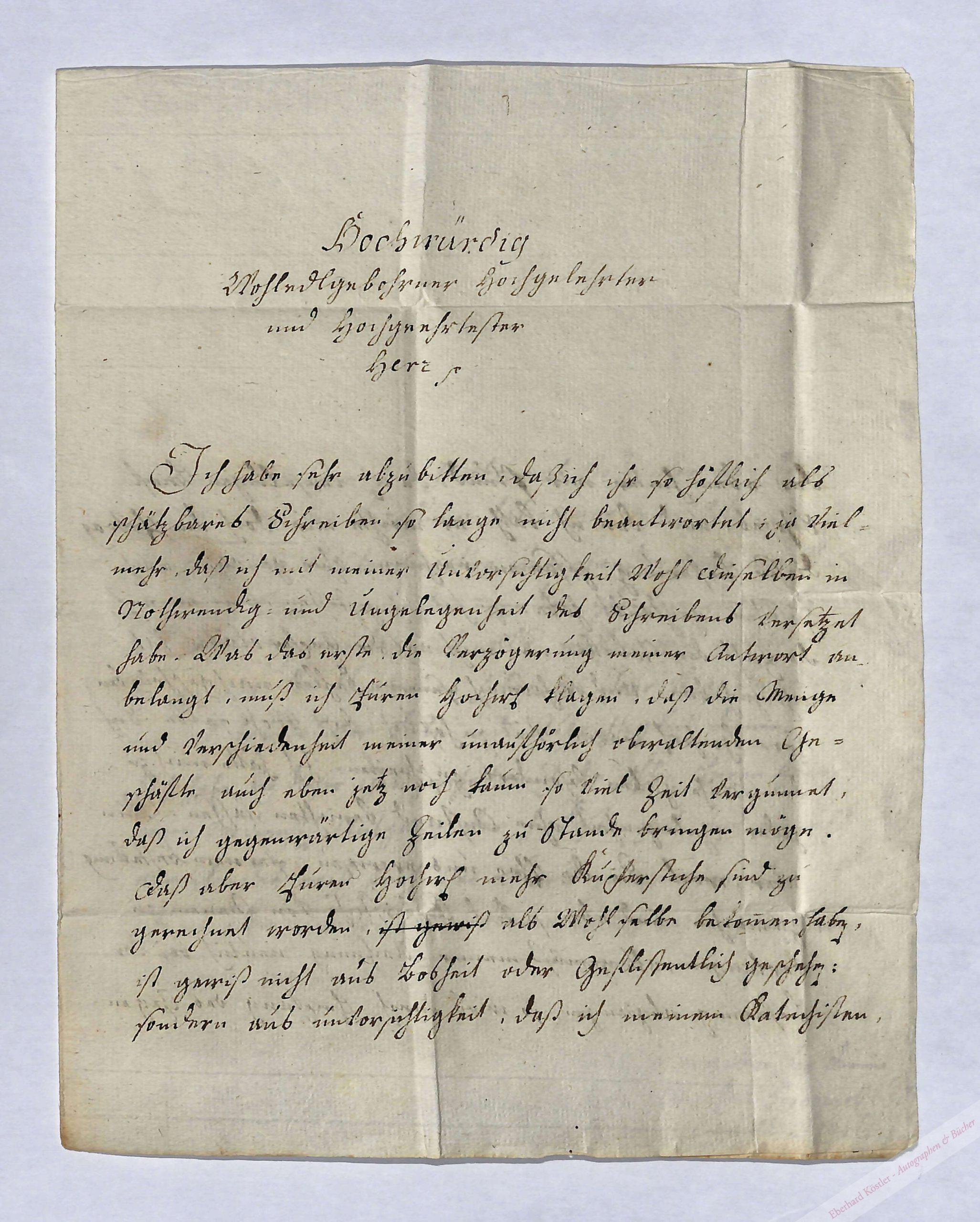 Eigenhändiger Brief mit Unterschrift Dillingen, 16. III. 1782, 4° (23,5 x 18,5 cm). 3 Seiten. Mit Adresse und Siegel.